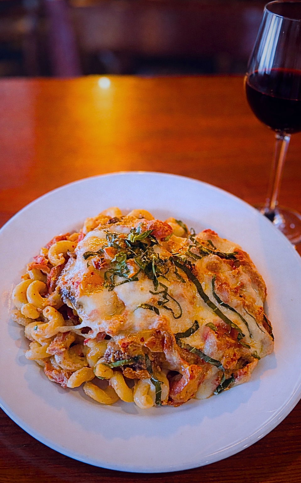 Shepherd's Pie—house made puff pastry layered with sweet pea puree, ground lamb and beef, carrots and onions, topped with mashed potatoes and a falernum gravy