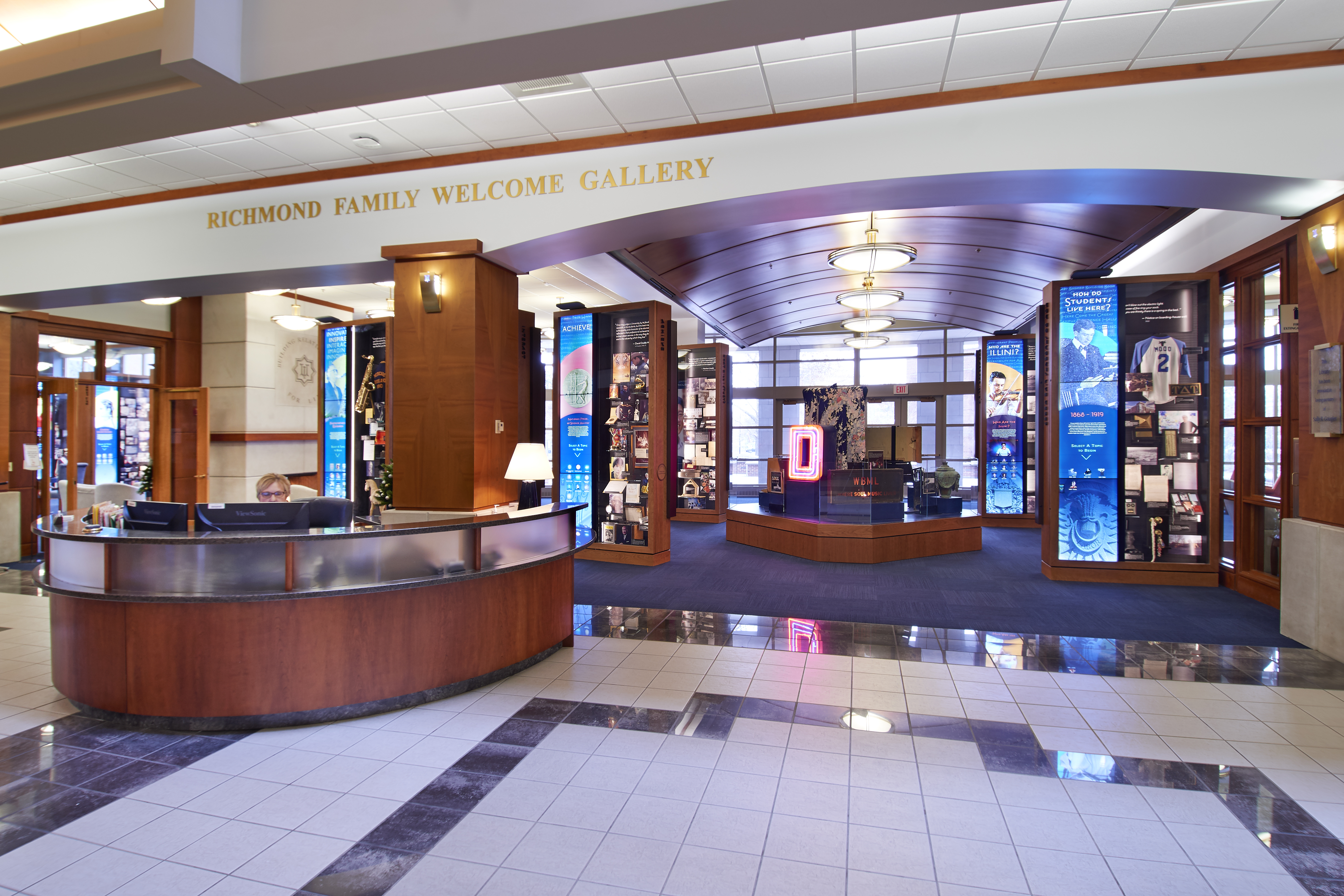 The Richmond Family Welcome Gallery at Alice Campbell Alumni Center is a showcase for the heritage and global impact of the University of Illinois at Urbana-Champaign, made possible through the generosity of the late Jack and Marjorie Richmond.