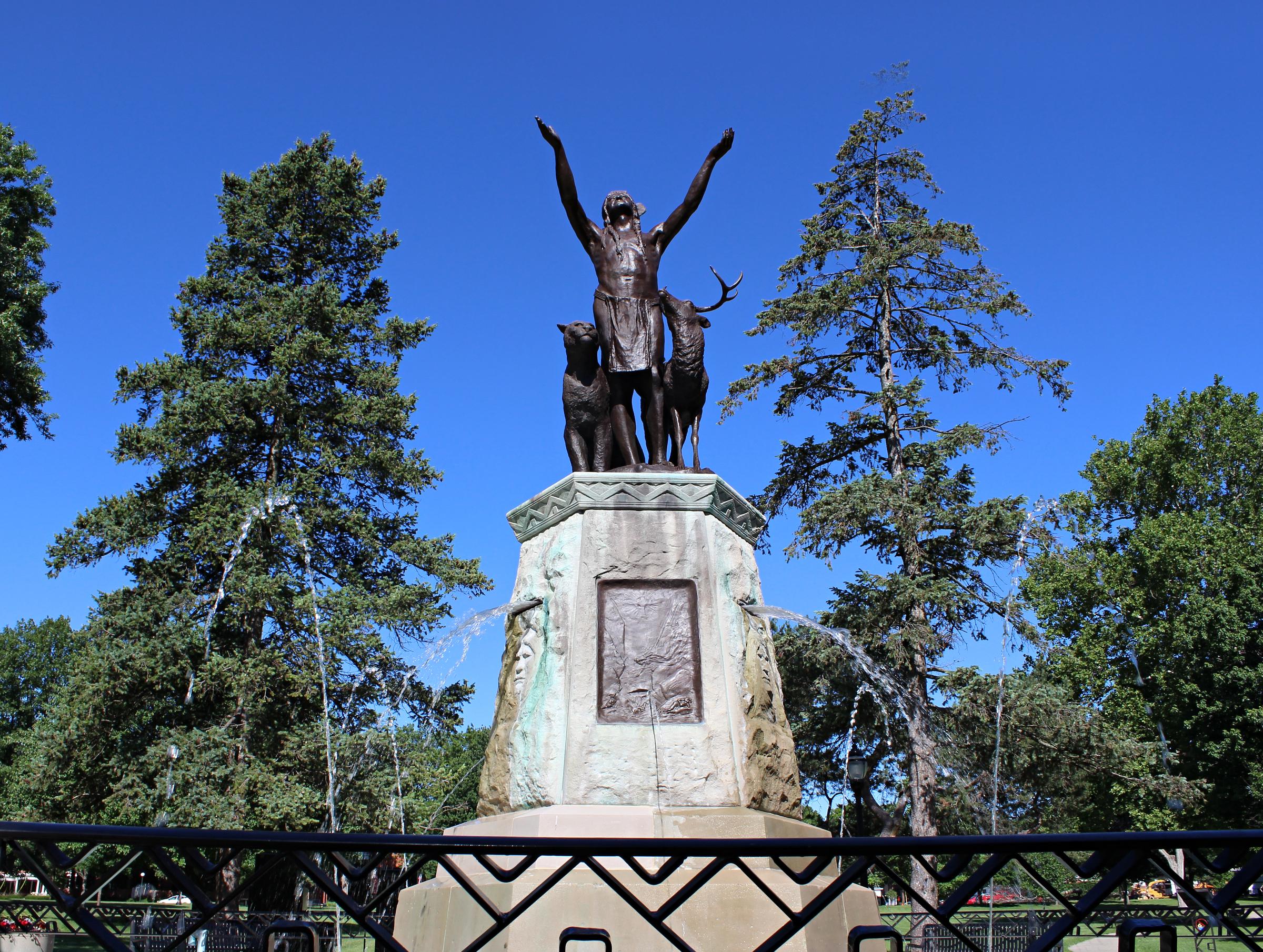 Over 120 years ago from atop the Prayer For Rain fountain, the likenesses of an American Indian, a panther, and a deer began keeping watch over West Side Park. The trio have borne witness to over a century of civic life in Champaign and have become a unique landmark for the community.