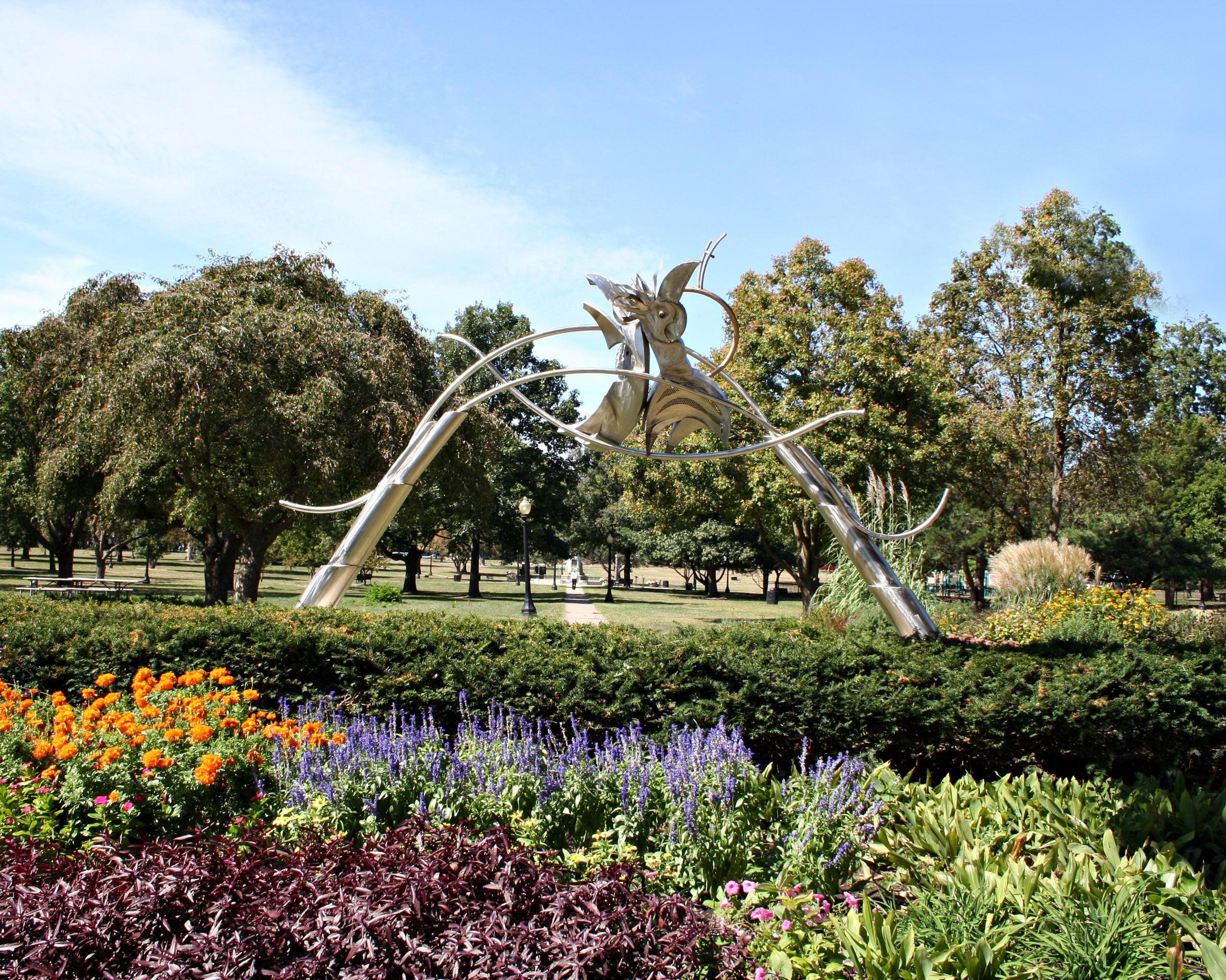 Double Dutch: A Jump for Joy has been a landmark in West Side Park since 2011. It was created by Gary Bibbs of Lexington, KY and measures in at 16 feet tall and 26 feet wide. The statue is made of stainless steel tubing and bronze, and was inspired by the joy and innocence of children at play.