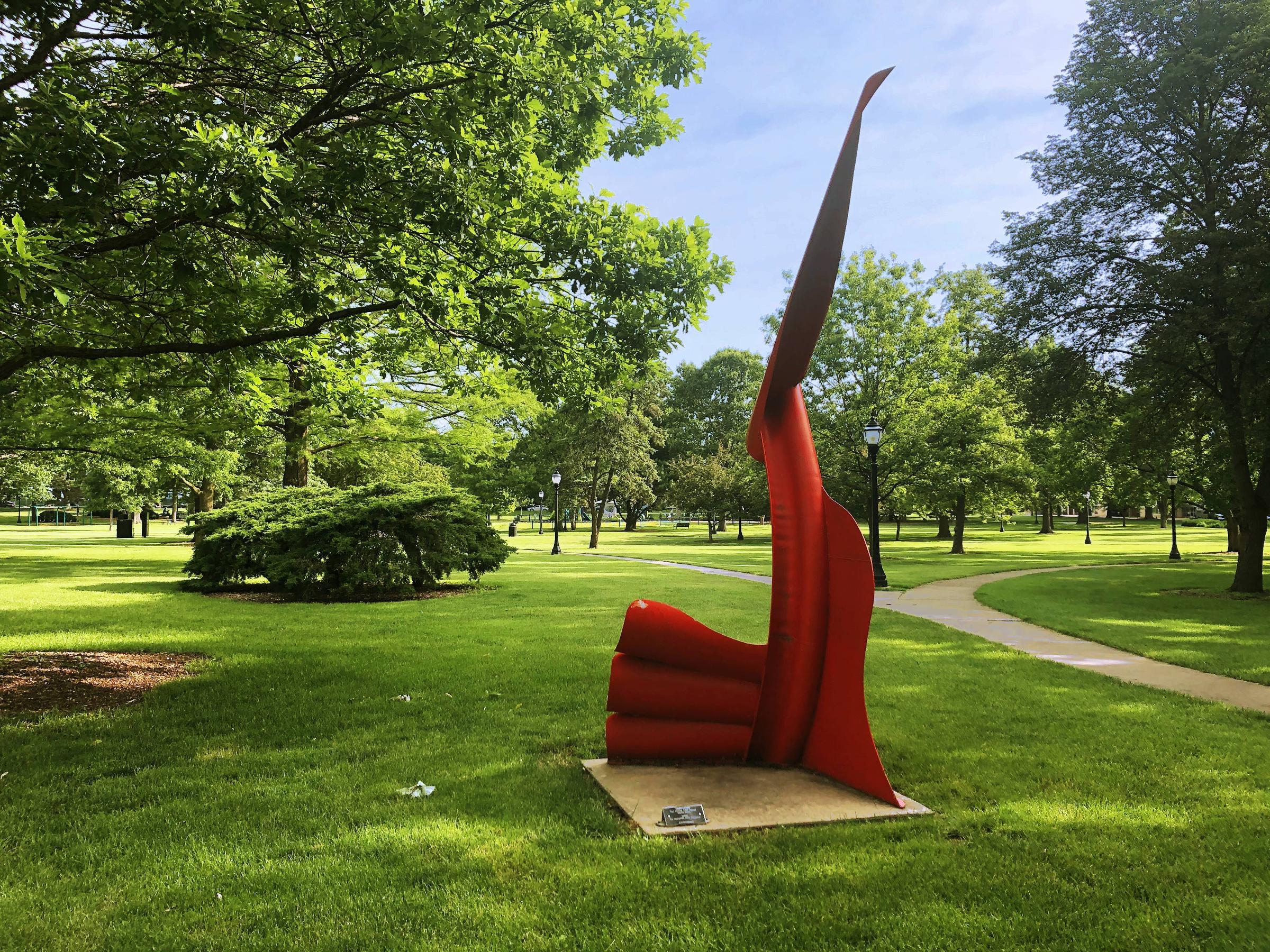 Uppercutted is on lease to the Champaign Park District through the Public Art League. It has been located at the southern end of West Side Park since 2013.