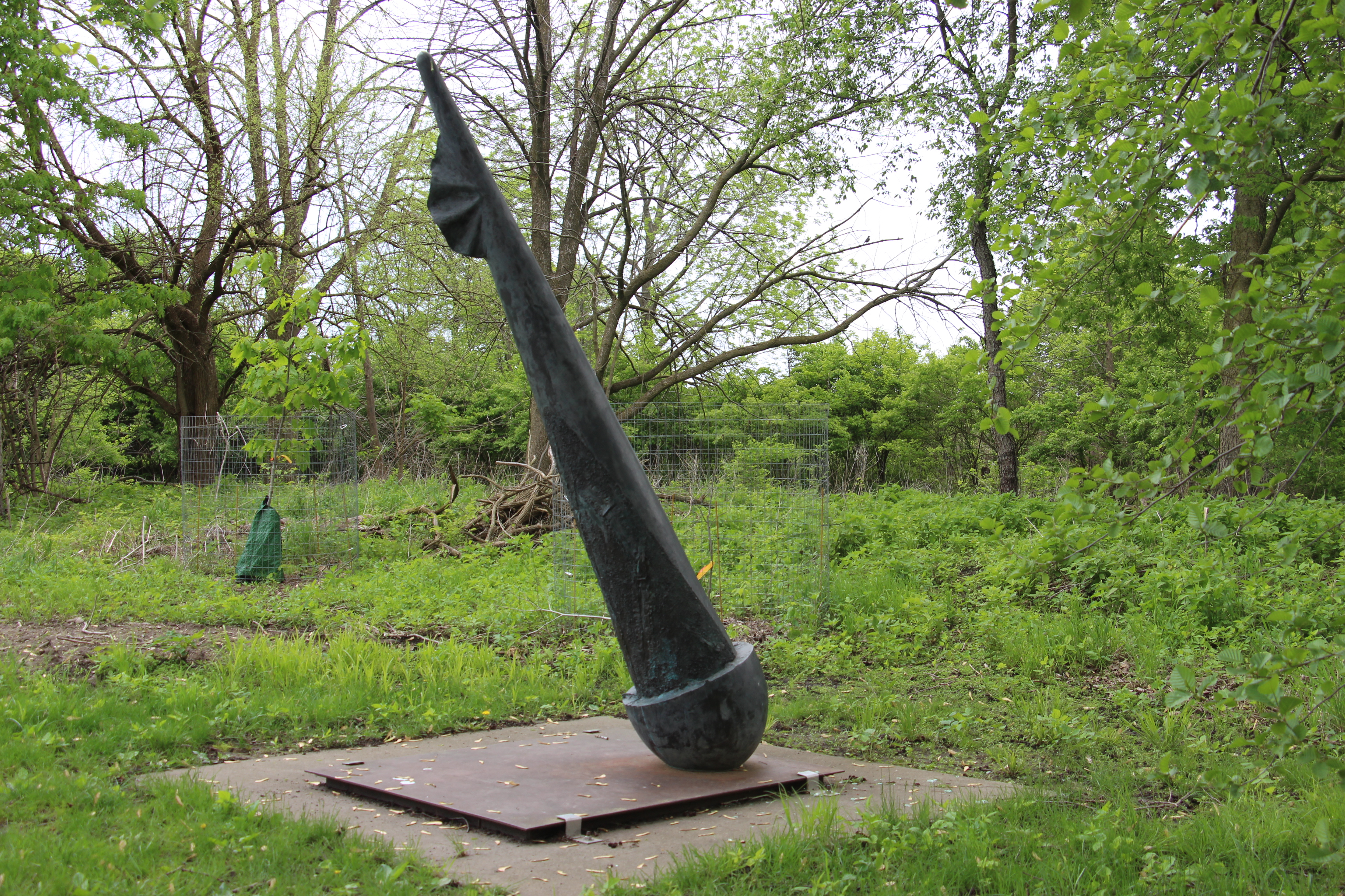 This sculpture of a bronze bouy on a sea of loam plays with textures and color to depict a scenic space.