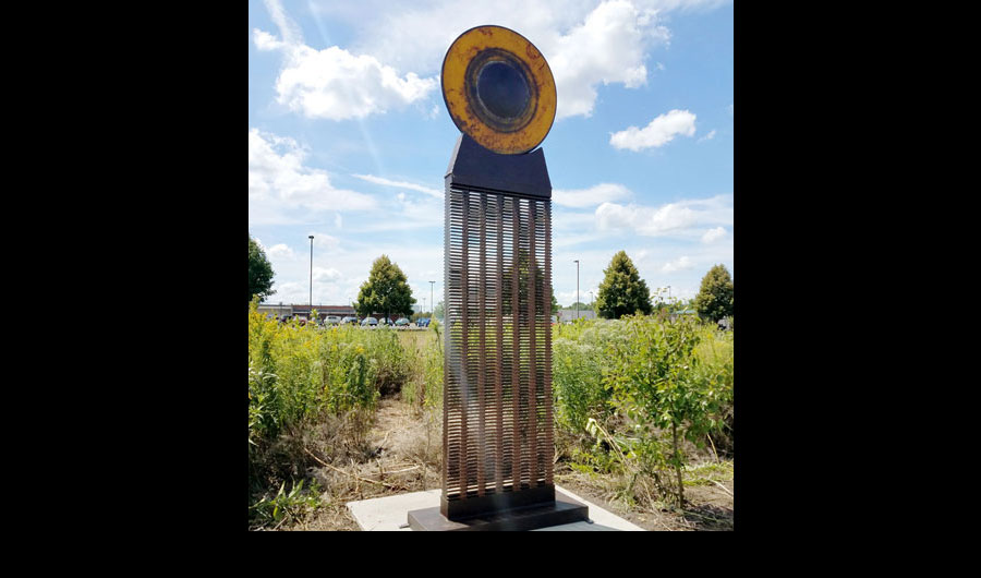 This work greets riders and walkers at the Urbana Kickapoo Rail Trail entrance with a subliminal sense of the processed heritage of the metal.