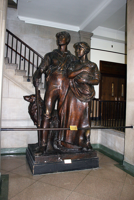 After completing the sketch model for the group, Taft described his intentions: “The young Pioneer has been at work, possibly in the field, where his young wife has run in alarm, her baby in her arms, to tell him of some possible danger. They stand together looking in the direction of their peril, the young husband alert, with gun in hand and his faithful dog by his side, while the young mother, a hardy, brave type of American womanhood, holds the infant with a protective gesture."
