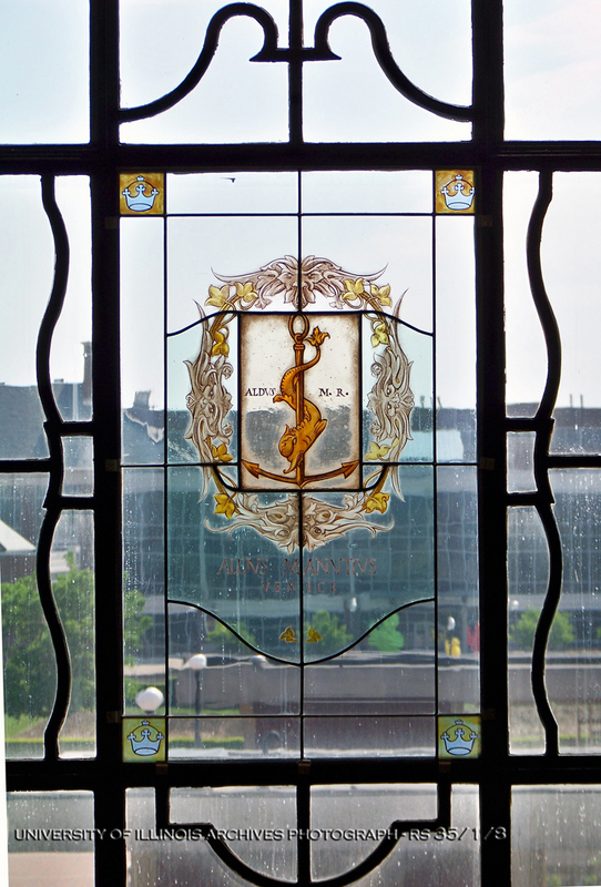 Williams (1887-1975) created the twenty-seven tinted glass panels found on the windows in the Reference Room and over the grand staircases in the Main Library. Each printers’ mark is 48” x 30”.