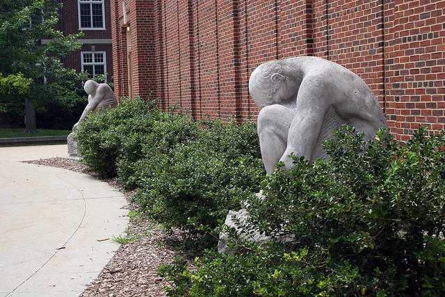 These sculptures invoke imagery derived from the Noah-like Greek myth in which Deucalion and Pyrrha, the only two people left on earth after a deluge, consult “a convenient oracle as to the best way of restoring the human race.”