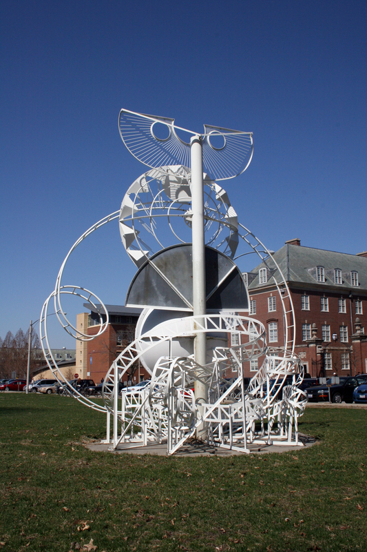 Aycock’s Tree of Life Fantasy appears on the landscape as an intriguing machine or play apparatus that gives no hint of function. The painted white sculpture is at once a mix of opaque, transparent, and linear parts: kinetic roller-coaster loops, washboard and trellis forms, and jagged edges. Although created in three dimensions, only its front, sited straight toward the viewer coming from the west, seems significant.