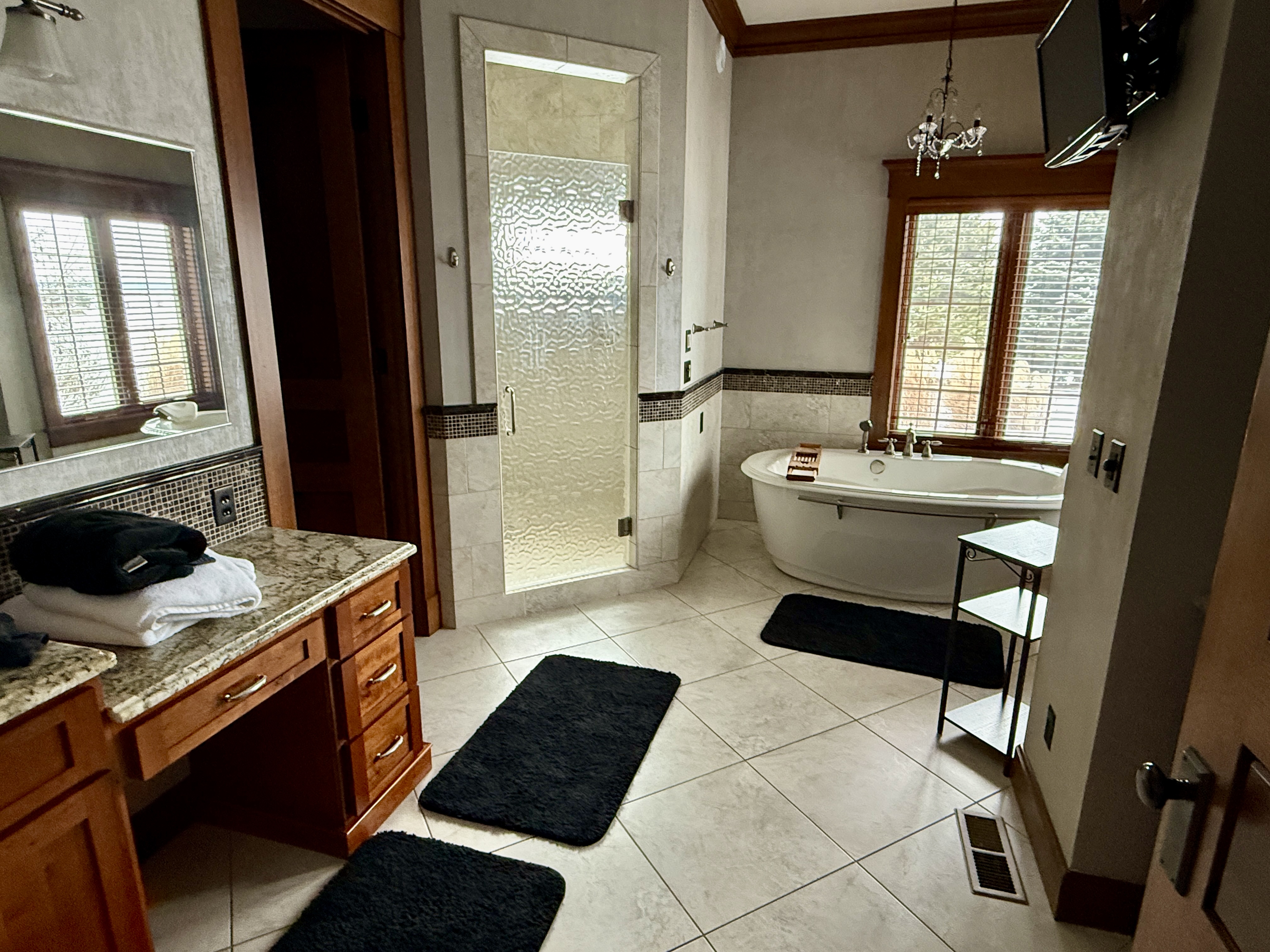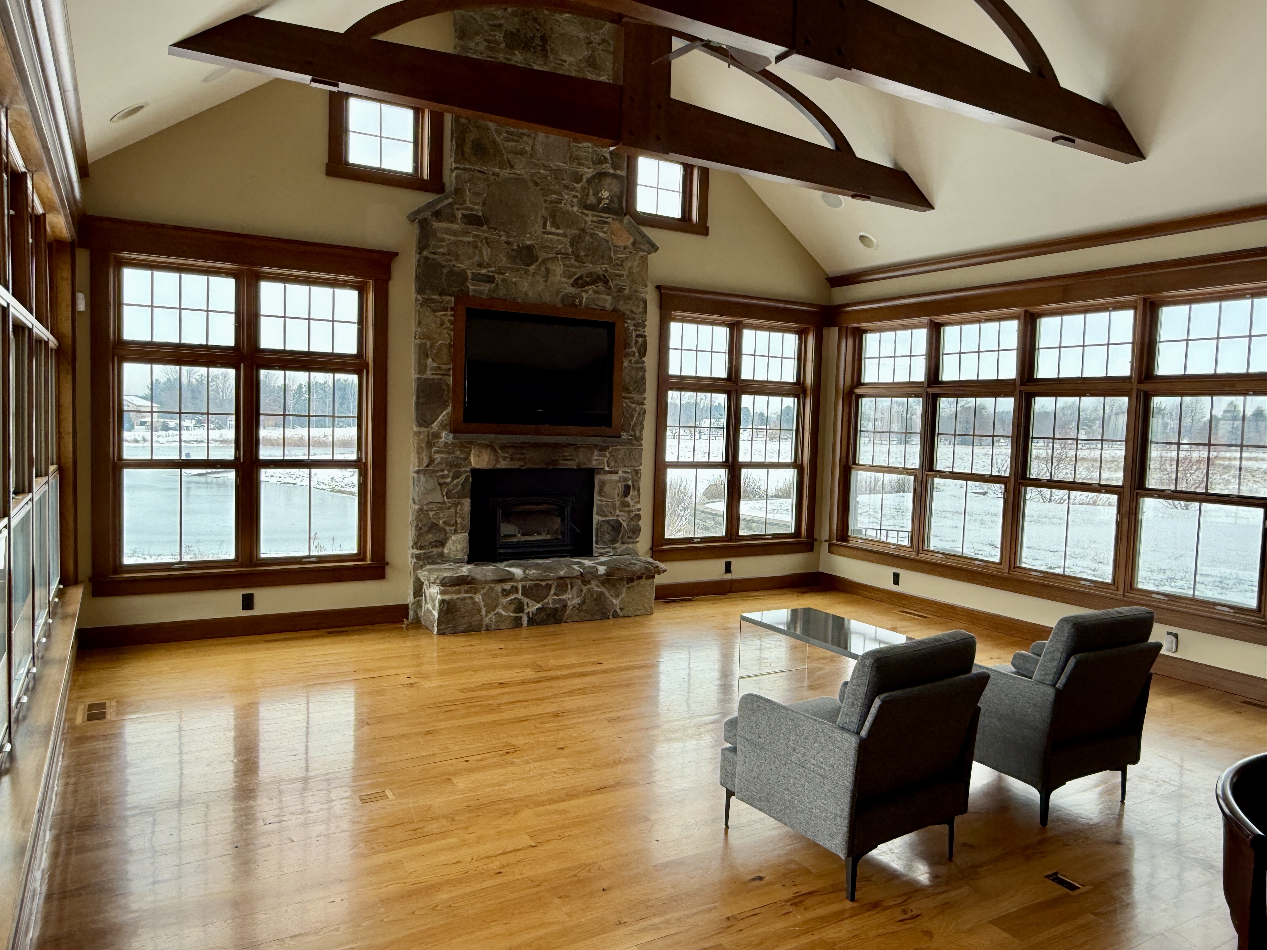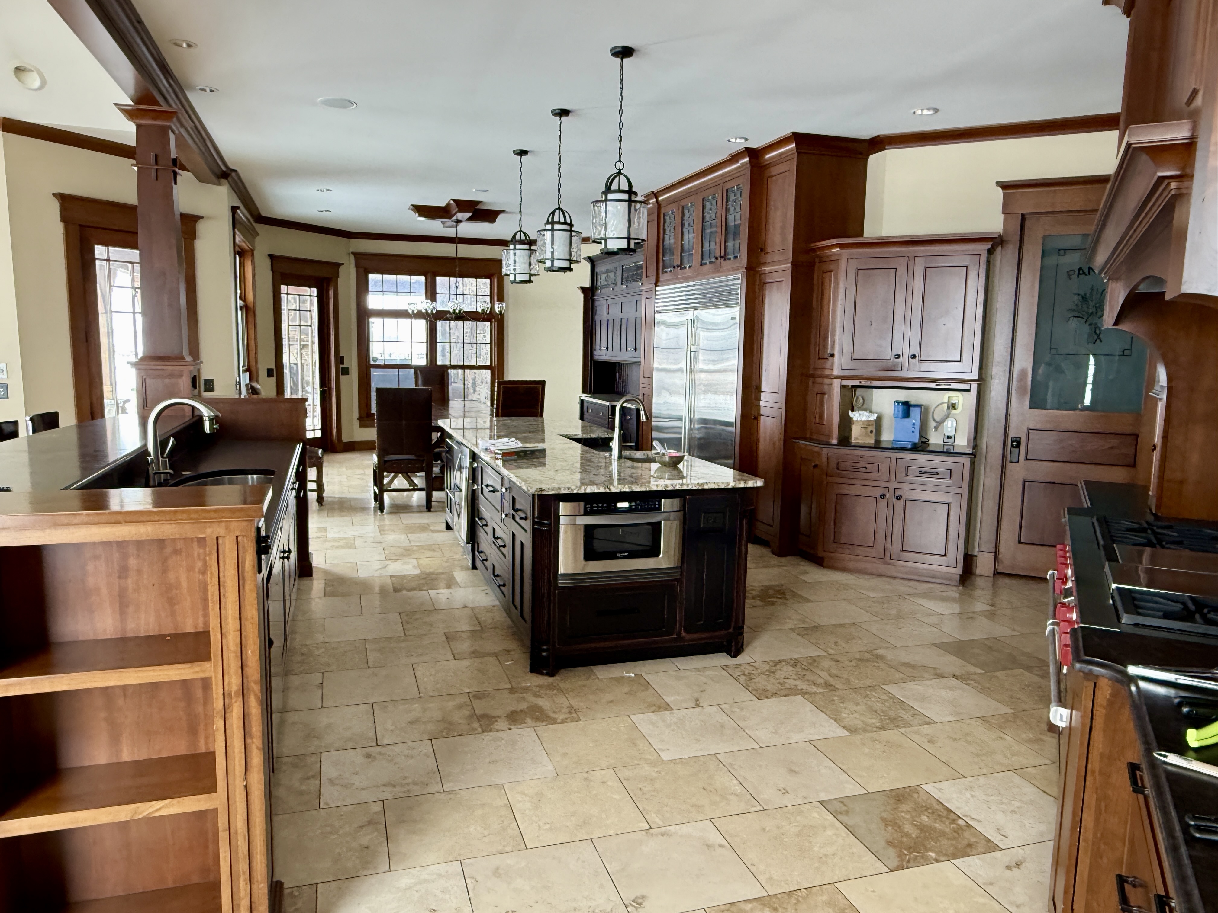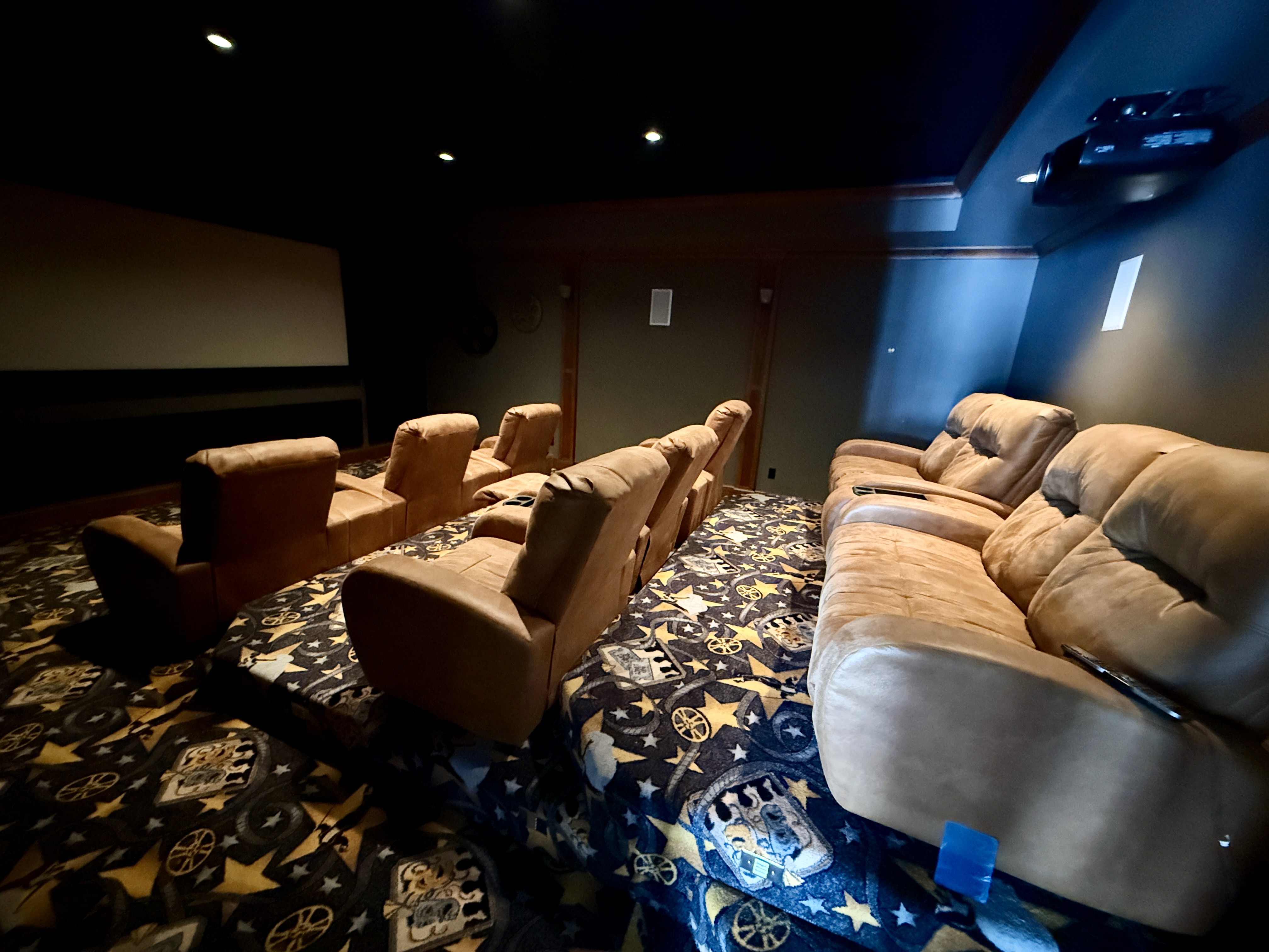 This large house features 6 bedrooms with attached bathrooms, a large kitchen, several entertainment areas, a movie theatre, and other amenities. It is located along a heart-shaped pond and adjacent to the Willow Creek Farm event venue.